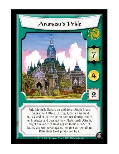 Raid Limited: Declare an additional Attack Phase. This is a Raid attack. During it, battles are Raid battles, and battle resolution does not destroy armies or Provinces and does not bow Pirate cards. After it, target a number of Holdings up to the number of battles you won (even against no units at resolution). Raise their Gold production by 4