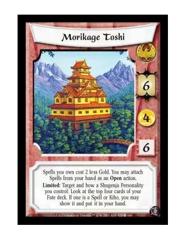 Spells you own cost 2 less Gold. You may attach Spells from your hand as an Open action. Limited: Target and bow a Shugenja Personality you control: Look at the top 4 cards of your Fate deck. If one is a Spell or Kiho, you may show it and put it in your hand