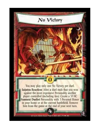 You may play only one No Victory per duel. Iaijutsu Reaction: After a duel ends that you won against the most expensive Personality another player controls (including ties): Create a 5F/4C Samurai Duelist Personality with 3 Personal Honor in your home or at the current battlefield. Remove him from the game at the end of your next turn.
