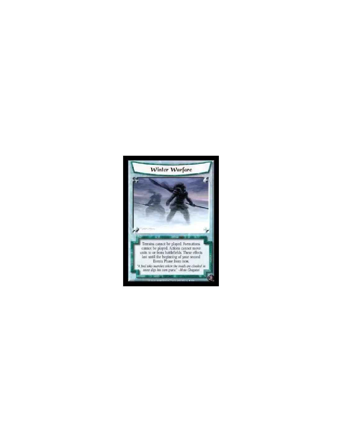 Terrains cannot be played. Formations cannot be played. Actions cannot move units to or from battlefields. These effects last until the beginning of your second Events Phase from now.