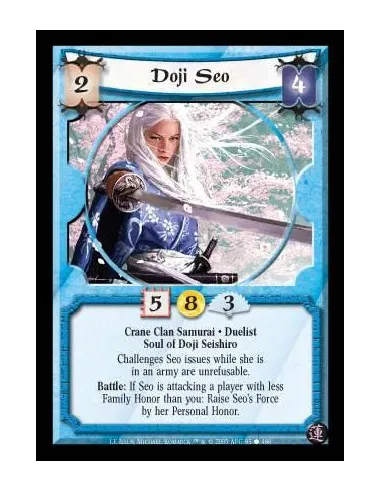 Crane Clan Samurai · Duelist · Soul of Doji Seishiro. Challenges Seo issues while she is in an army are unrefusable. Battle: If Seo is attacking a player with less Family Honor than you: Raise Seo's Force by her Personal Honor
