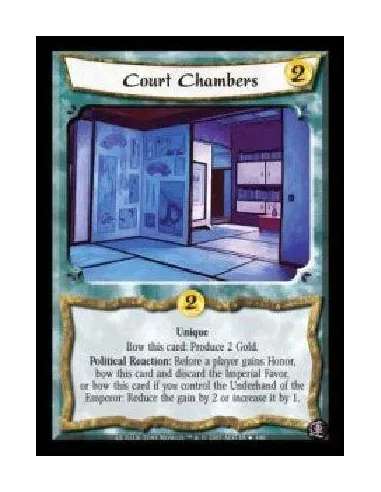 Unique. Bow this card: Produce 2 Gold. Political Reaction: Before a player gains Honor, bow this card and discard the Imperial Favor, or bow this card if you control the Underhand of the Emperor: Reduce the gain by 2 or increase it by 1