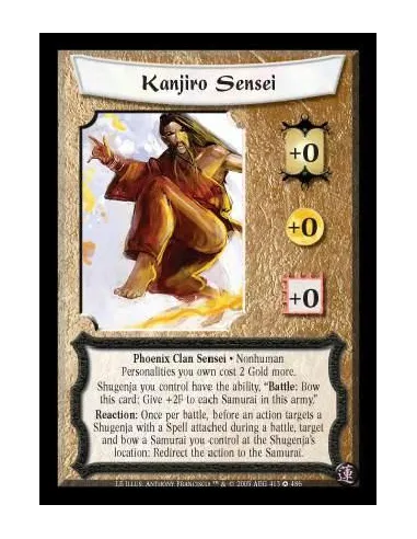 Phoenix Clan Sensei · Nonhuman Personalities you own cost 2 Gold more. Shugenja you control have the ability, ?Battle: Bow this card: Give +2F to each Samurai in this army.? Reaction: Once per battle, before an action targets a Shugenja who has a Spell attached during a battle, target and bow a Samurai you control at the Shugenja's location: Redirect the action to the Samurai
