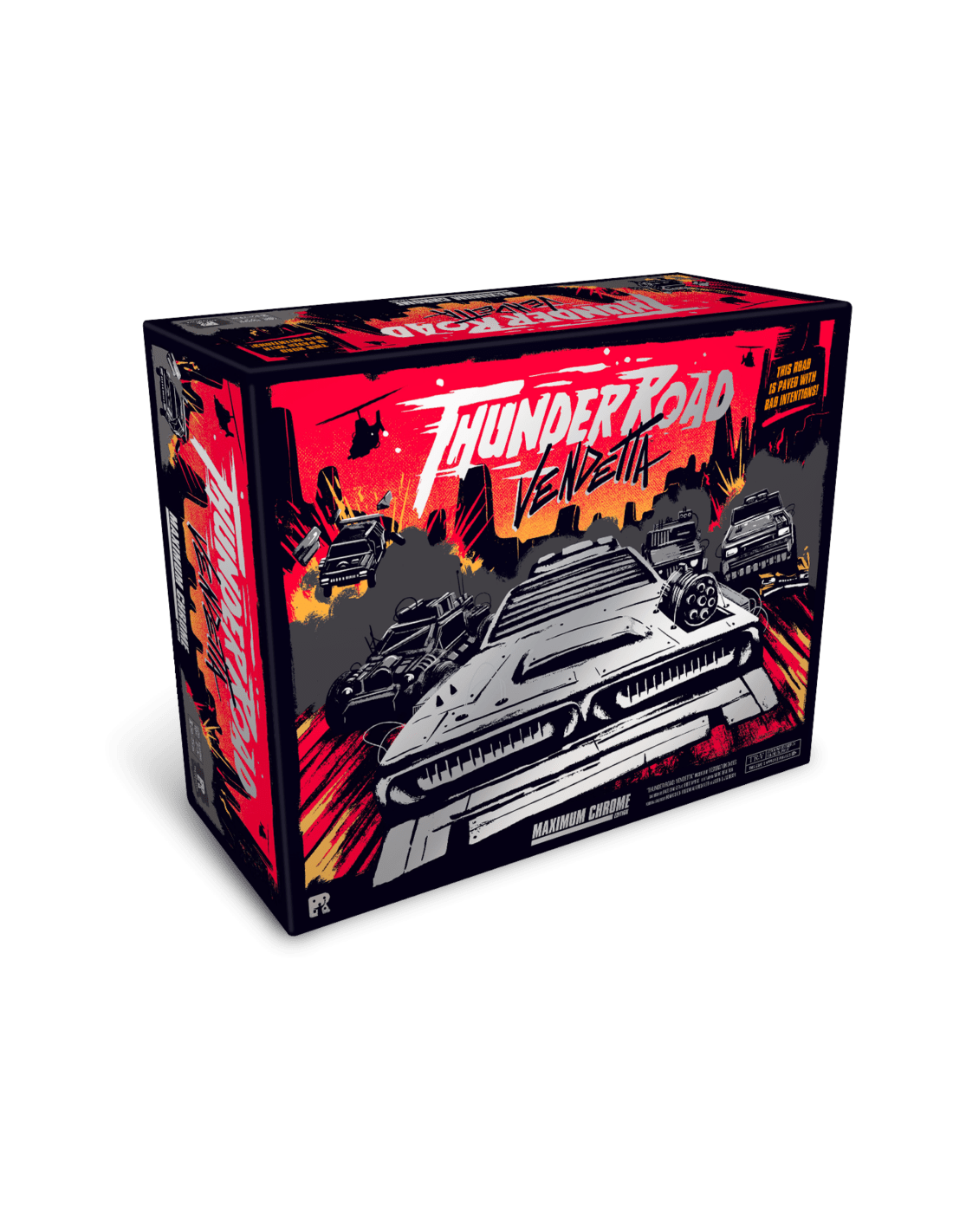 Thunder Road Vendetta: Maximum Chrome - Limited Edition is a board game that returns with a revitalized restoration of the classic 1986 asphalt chaos game in a Limited Edition packed with chrome and new components. Grab your crew, roll the dice, race your cars, fire your weapons, and try not to get wrecked. Enjoy a totally revamped and recharged game!