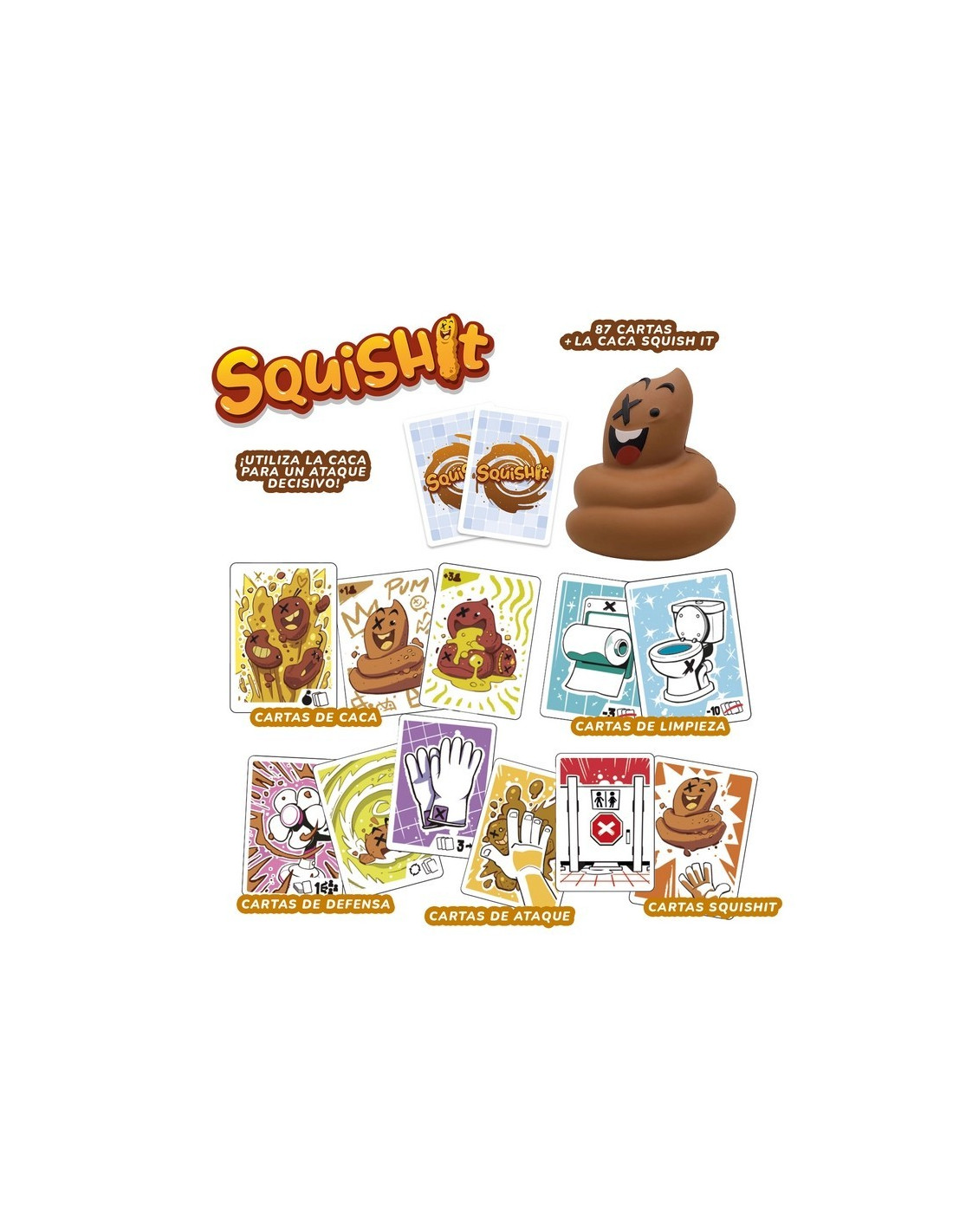 The magnificent Squishit? Poop! board game. A cheeky theme with poop cards and clever mechanics to make everyone laugh. Use Attack, Defense, and Cleanup cards to keep your bum clean while you poop at others.