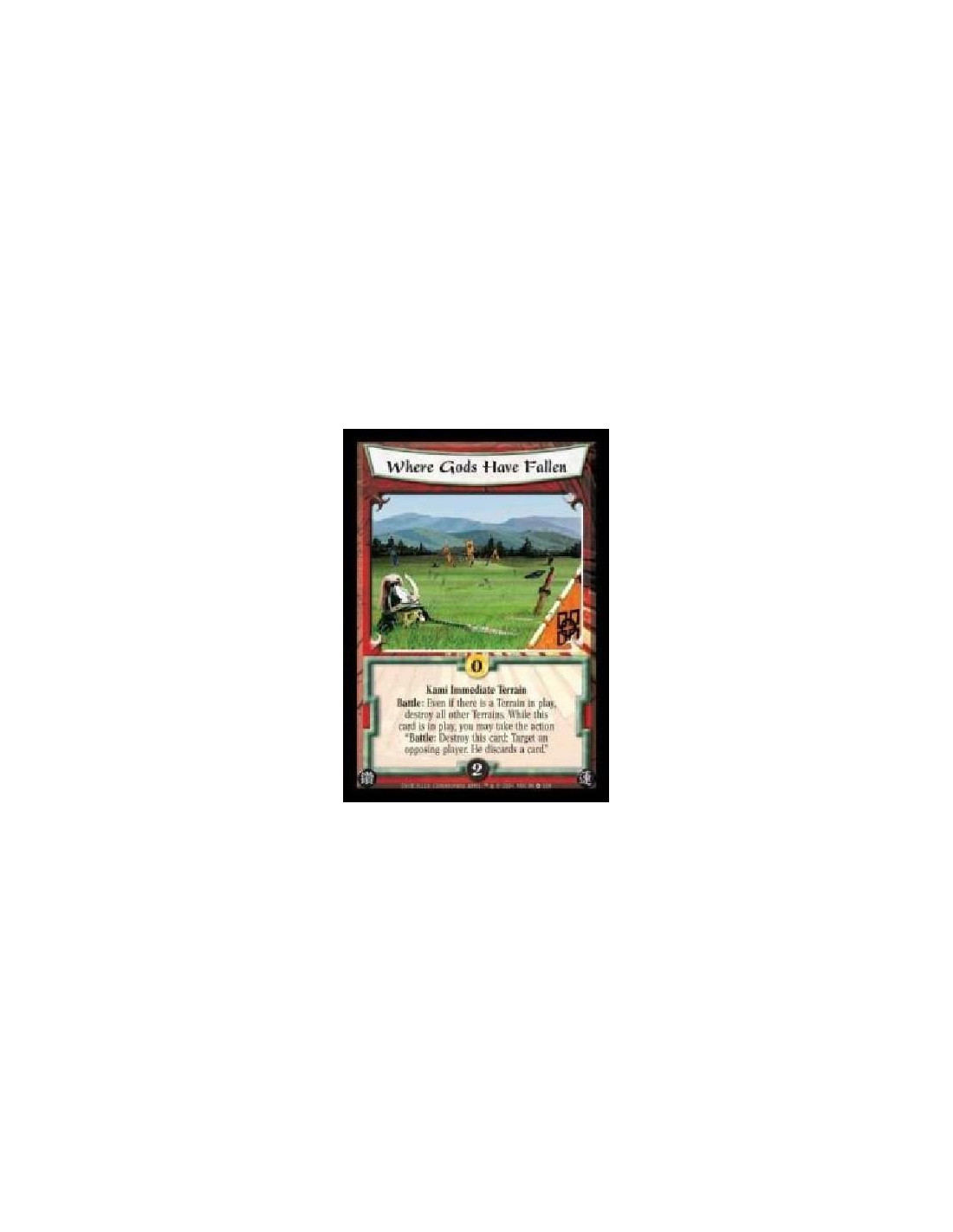 Kami Immediate Terrain. Battle: Even if there is a Terrain in play, destroy all other Terrains. While this card is in play, you may take the action ?Battle: Destroy this card: Target an opposing player. He discards a card.