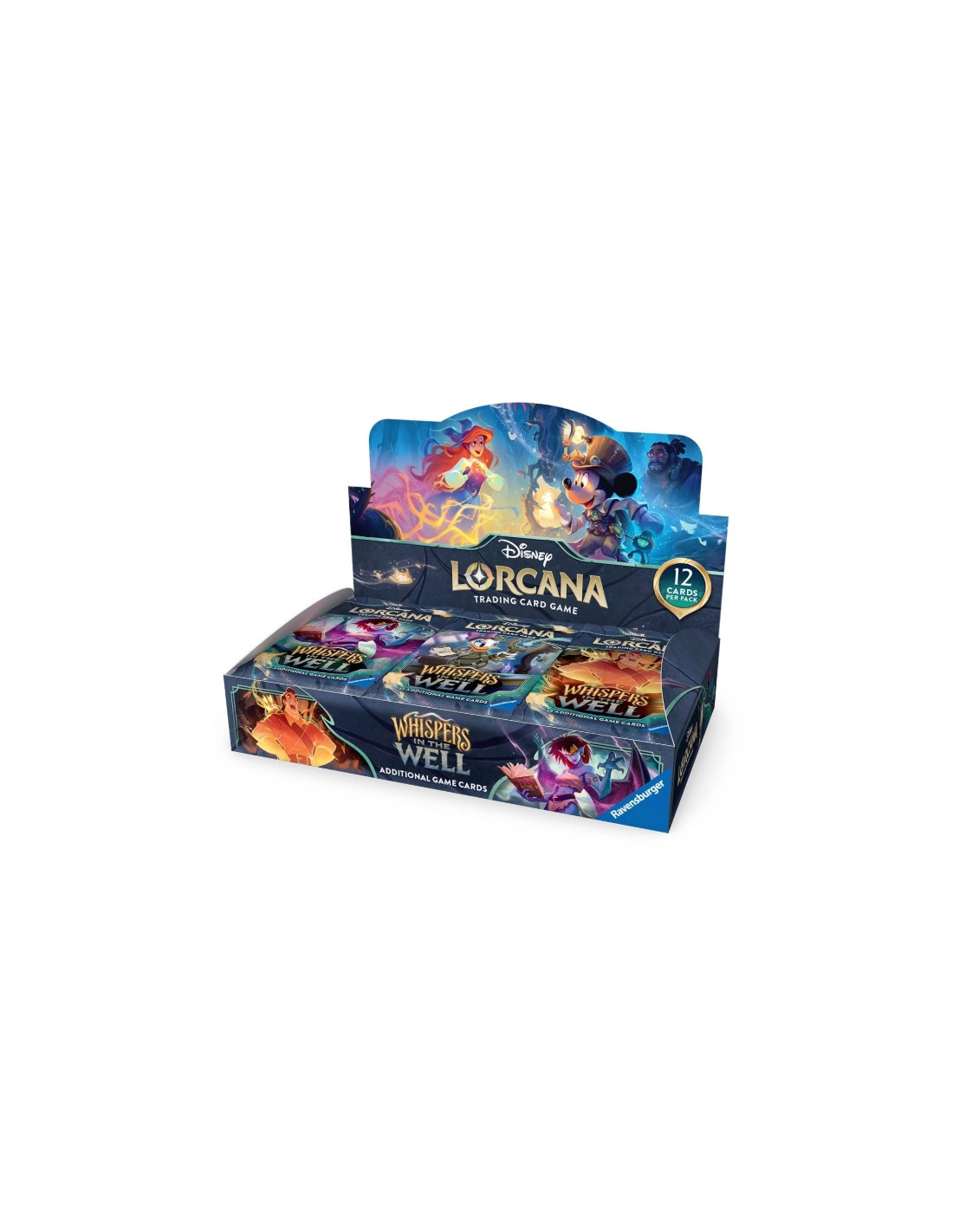 Display with 24 booster packs from the Disney Lorcana TCG Whispers in the Well set. Each pack includes cards to expand, customize, or build new decks, for a total of 288 cards per box. Ideal for specialty retailers, these displays offer a complete experience for players looking to enhance strategies, discover characters, and engage in trading.