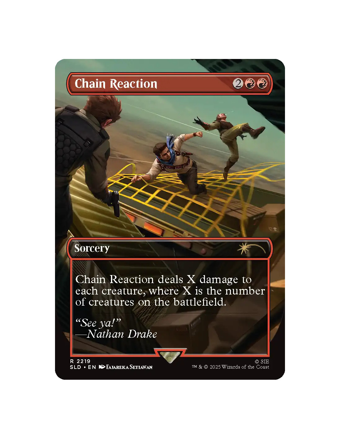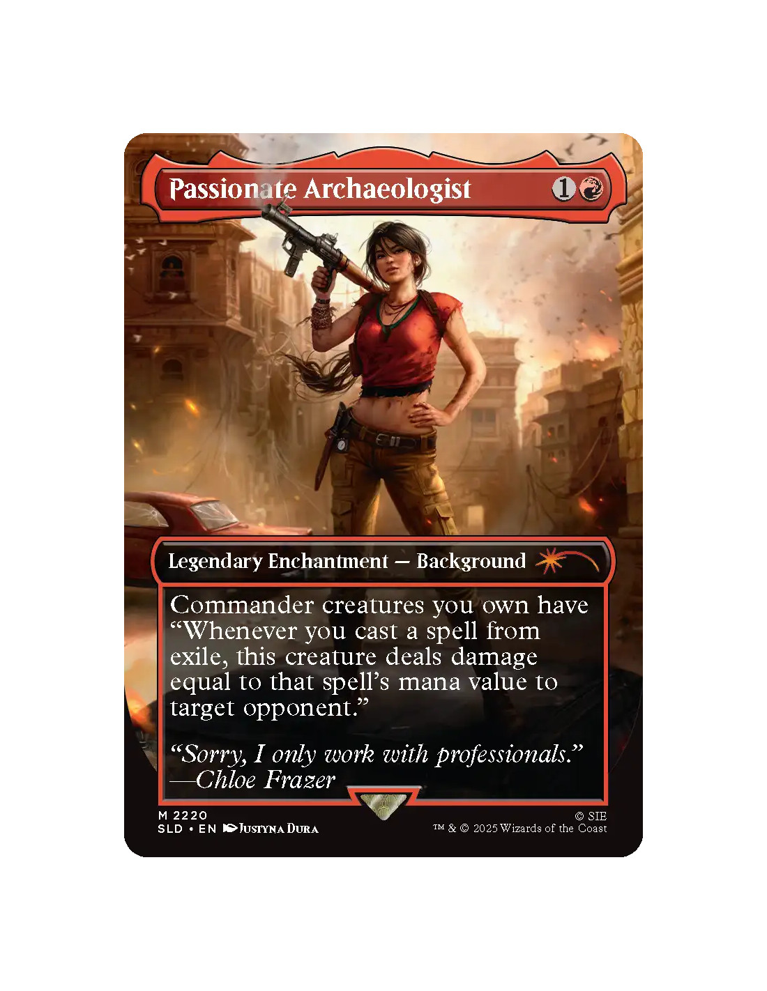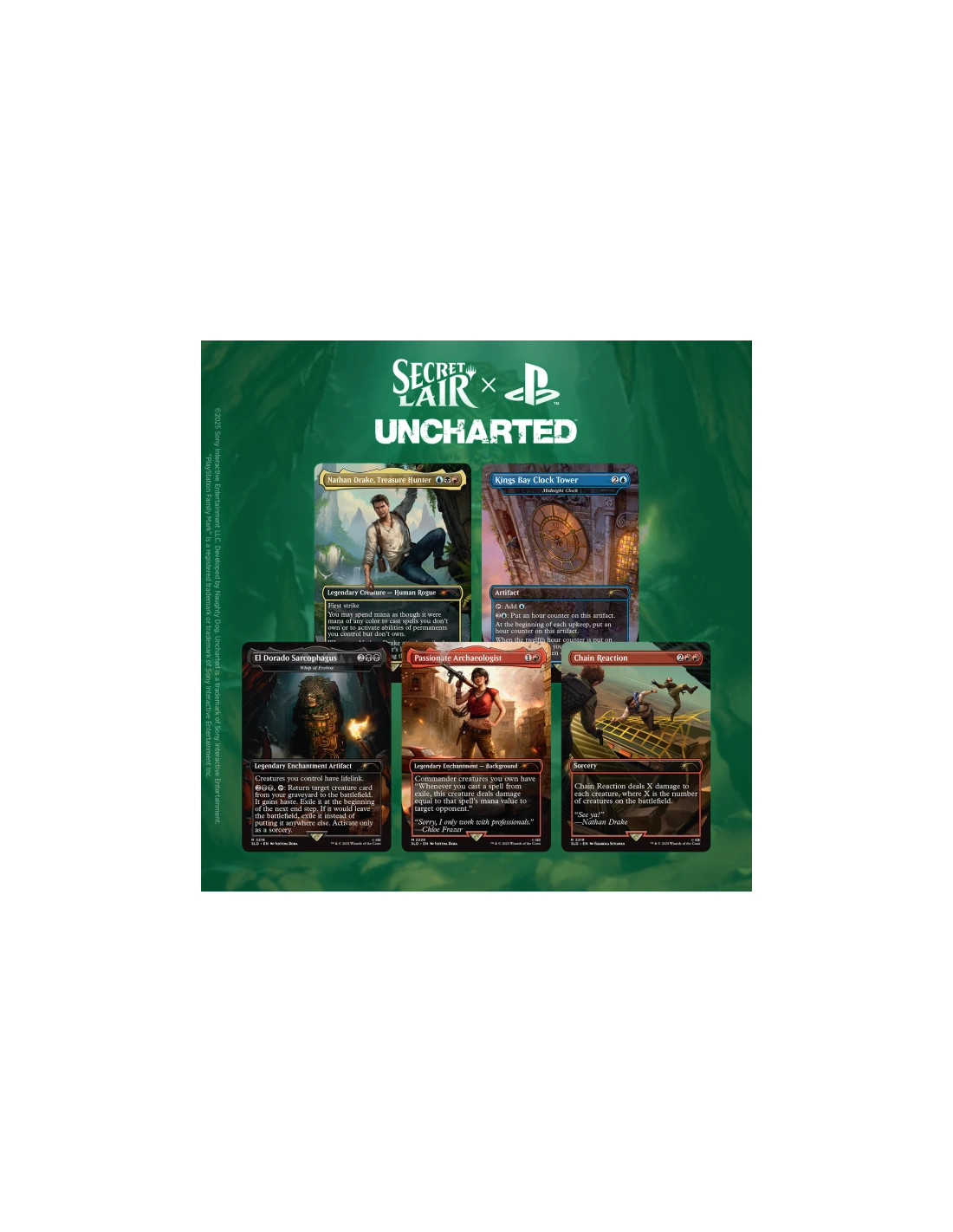 Secret Lair x Uncharted brings the world’s most daring treasure hunter to Magic: The Gathering with style and a roguish charm that comes alive through brand-new card designs. And finally, he can get his hands on the many artifacts and treasures he’s after — featuring the iconic Whip of Erebos as “El Dorado Sarcophagus”. Or perhaps he’ll just bide his time and wait for the perfect moment to make his move with Midnight Clock reimagined as “Kings Bay Clock Tower.” Either way, he’ll need good allies — like Passionate Archaeologist — to make sure there’s some honor among thieves.