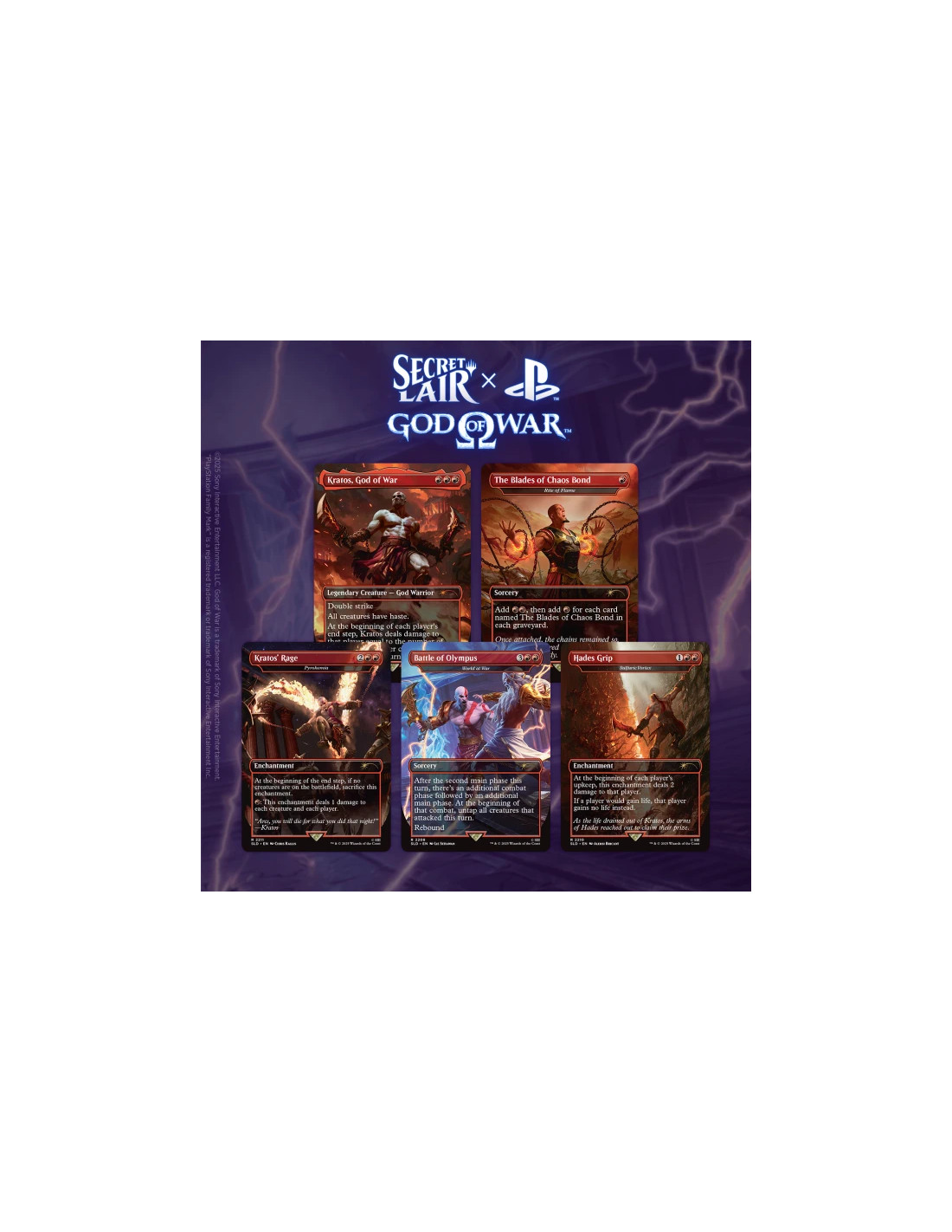 And now he can be your Commander! Secret Lair x God of War: Greek features a brand-new design for Kratos in his war against the Greek gods, showcased in a fiery red drop that captures his burning rage and Spartan heritage. Kratos is always eager to strike first, so grant him the blessing of extra combat phases with World at War as “Battle of Olympus,” and then unleash your fury with cards representing legendary weapons powerful enough to slay the divine, like “Blades of Chaos Bond,” “Hades Grip,” and “Kratos’ Rage.”