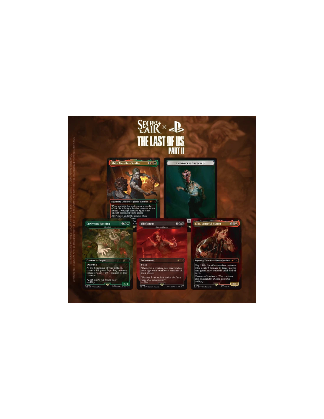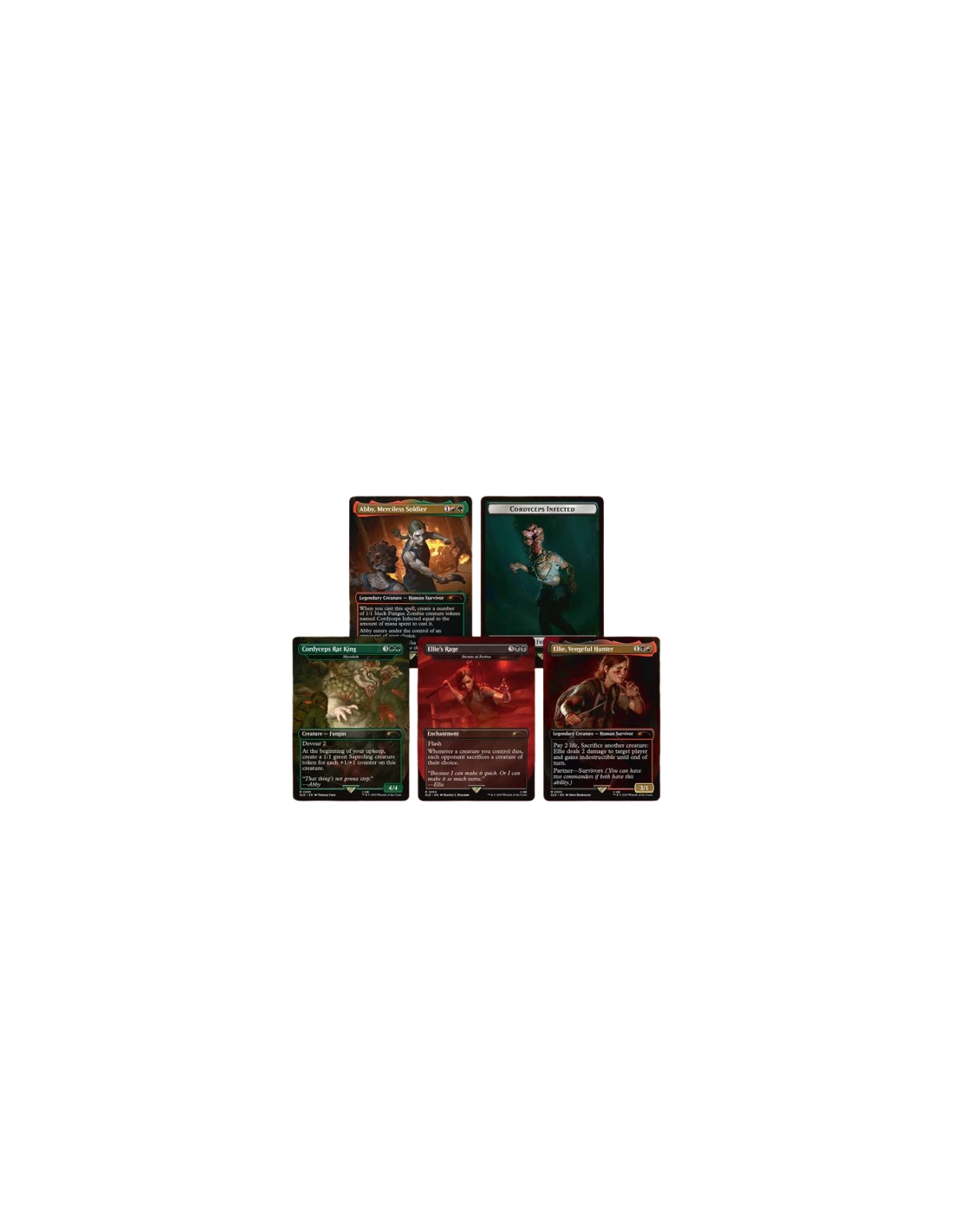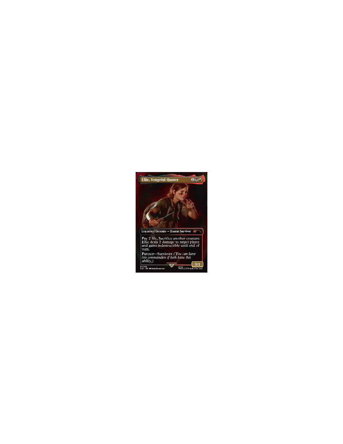 NOTE: The “Survivors” partner mechanic allows you to play the Joel and Ellie cards from Secret Lair x The Last of Us Part I with the Abby and Ellie cards from Secret Lair x The Last of Us Part II. This means that, technically, Ellie can team up with her younger self (and Abby can team up with Joel—if you’re a monster).