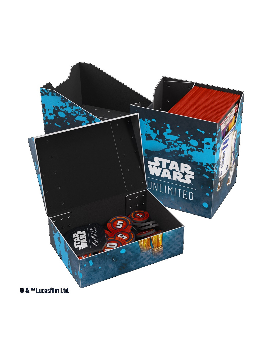 Our Star Wars™: Unlimited Soft Crate Deck Box is the all-in-one solution for fans of Star Wars™: Unlimited. This deck box is printed in full color with official designs and includes many clever features. It holds a complete double-sleeved deck and also includes an innovative token box. This box features a smart locking mechanism that keeps the tokens from falling out, even when the box is removed. Once opened, the lid stays open so you can easily access the contents during gameplay.