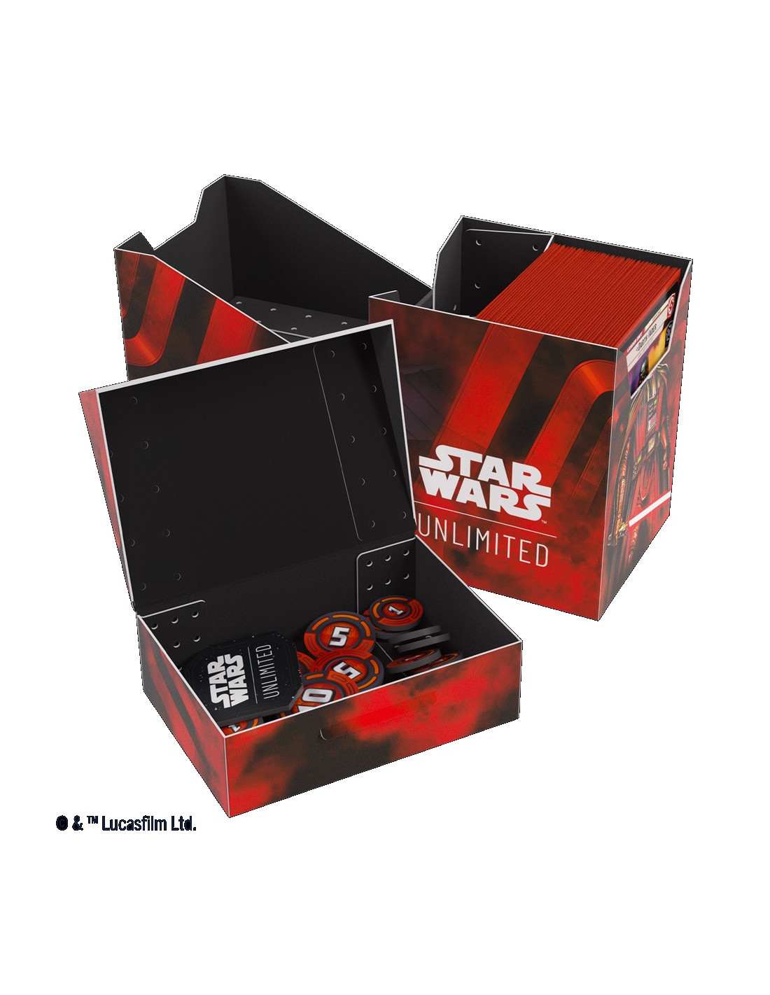 Our Star Wars™: Unlimited Soft Crate Deck Box is the all-in-one solution for fans of Star Wars™: Unlimited. This deck box is printed in full color with official designs and includes many clever features. It holds a complete double-sleeved deck and also includes an innovative token box. This box features a smart locking mechanism that keeps the tokens from falling out, even when the box is removed. Once opened, the lid stays open so you can easily access the contents during gameplay.