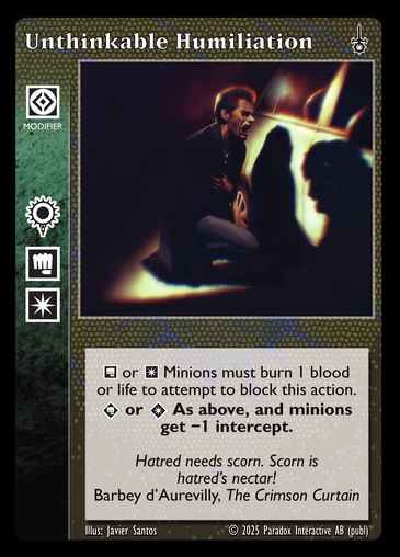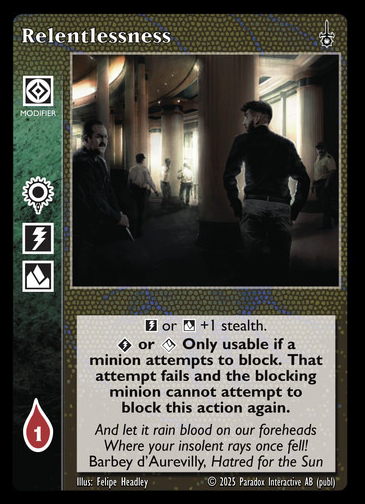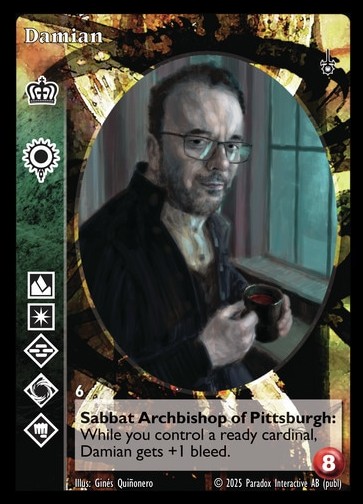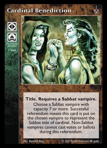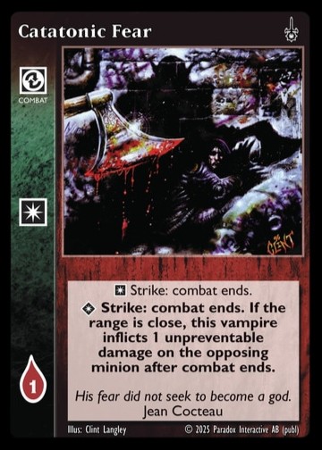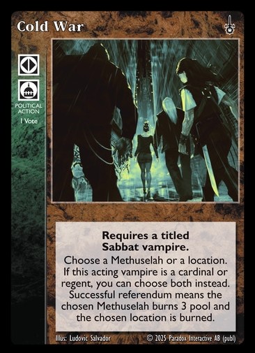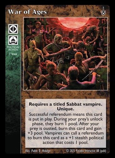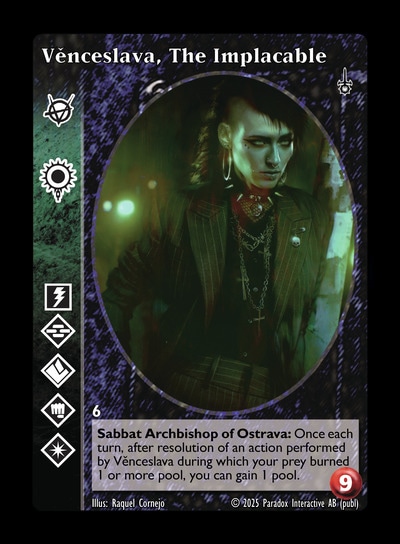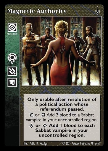 The Sabbat vampires you command with this deck are expert manipulators and fierce warriors. With their powers of Dominate and Presence, they incite obedience and unrest in equal measure, while Potence and Fortitude ensure they can enforce their rule with brutal efficiency.