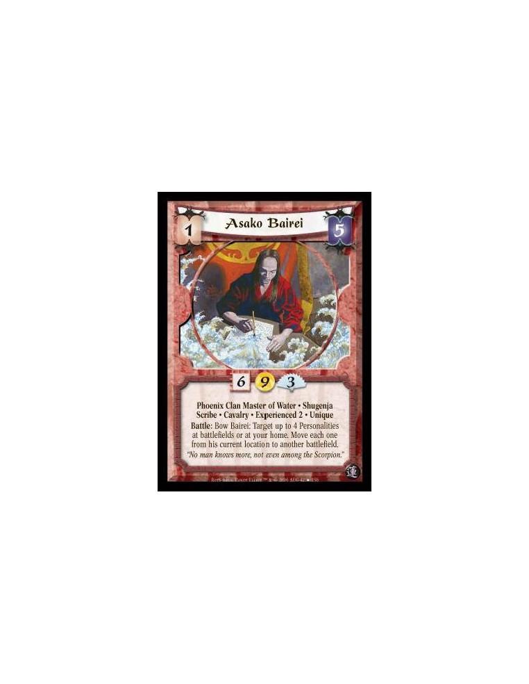 Phoenix Clan Master of Water · Shugenja · Scribe · Cavalry · Experienced 2 · Unique. Battle: Bow Bairei: Target up to 4 Personalities at battlefields or at your home. Move each one from his current location to another battlefield.