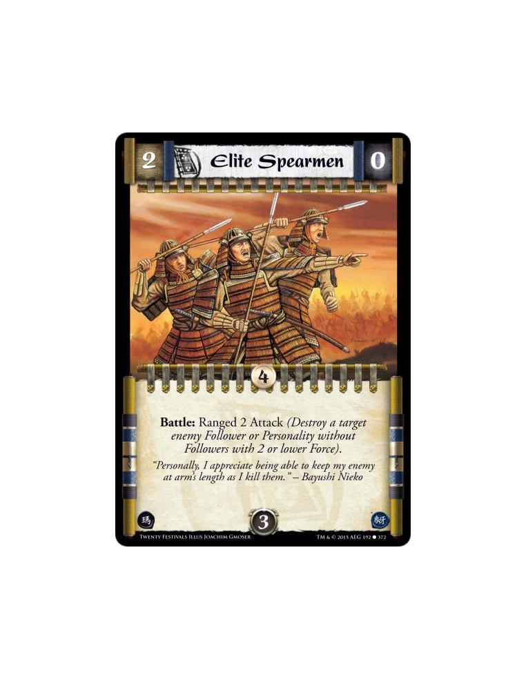 Battle: Ranged 2 Attack (Destroy a target enemy Follower or Personality without Followers with 2 or lower Force).