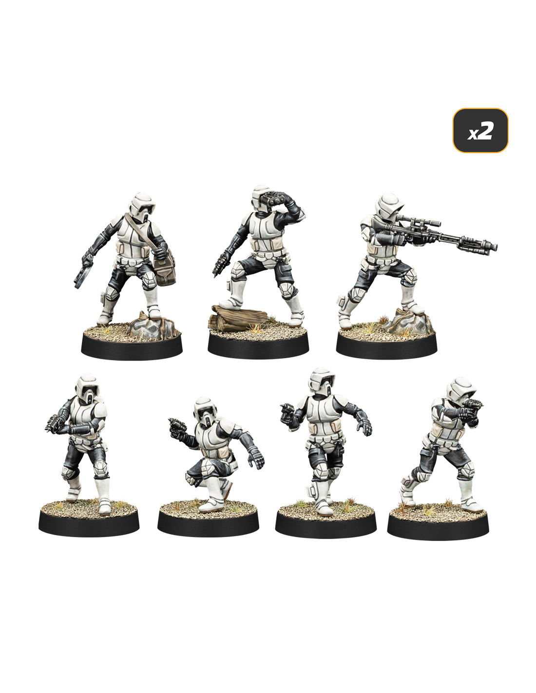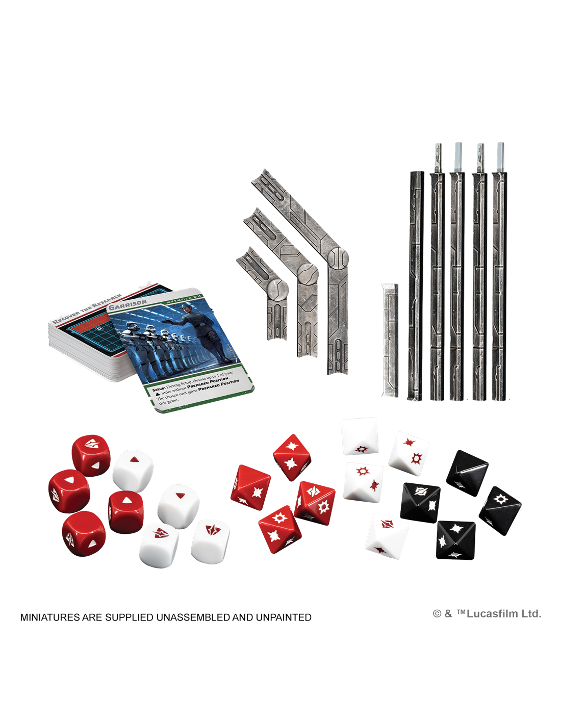 37 miniaturas, 7 cartas de Unidad, 15 cartas de Mejora, 10 cartas de Mando, 24 cartas de Batalla, 4 dados rojos de ataque, 4 dados negros de ataque, 4 dados blancos de ataque, 4 dados rojos de defensa, 4 dados blancos de defensa, 3 láminas de fichas, 1 hoja de información, 1 juego de plantillas de movimiento (larga, mediana y corta), 1 juego de reglas de alcance (½ y 1, en 5 segmentos)