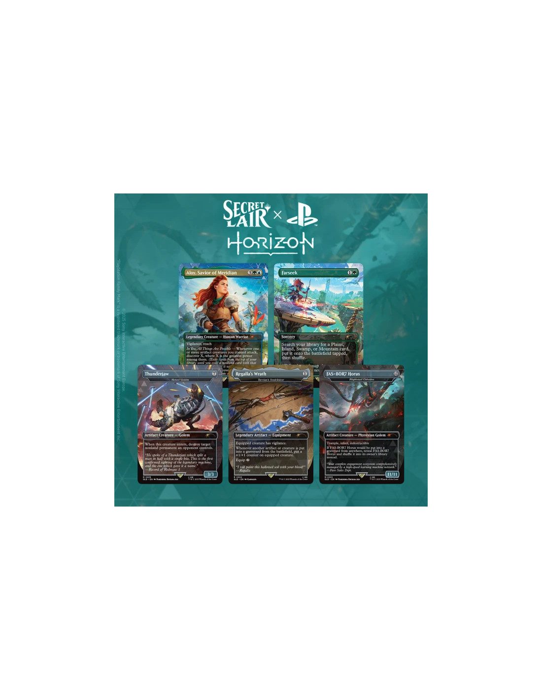 Además de una carta de Magic totalmente nueva que presenta a la mayor cazadora de máquinas del mundo, el drop Secret Lair x Horizon: Into the Forbidden West también muestra las impactantes máquinas colosales por las que se conocen estos juegos. Hazte con la vista de un Cuellilargo con la Visión lejana, juega un Coloso de acero corrupto como la antigua máquina de guerra “FAS-BOR7 Horus” o un Gólem meteoro como un “Atronador”. Y con la Hendealmas de Tarrian como el arco “Ira de Regalla” que Aloy reclamó en el Kulrut, ten por seguro que la redentora de Meridian estará totalmente equipada para el viaje al Oeste Prohibido.