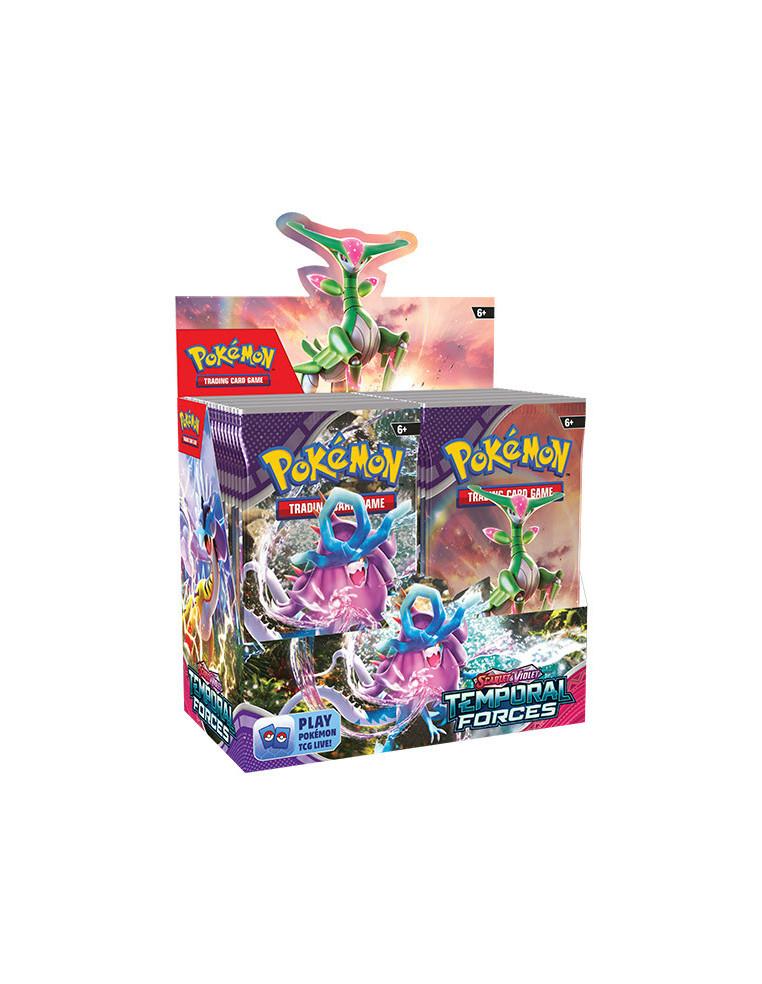 The Pokémon CompanyThe ranks of Ancient and Future Pokémon continue to grow! Walking Wake ex breaks free of the past alongside Raging Bolt ex, while Iron Leaves ex delivers high-tech justice with Iron Crown ex. Outside Area Zero, Wugtrio and Farigiraf shift types as Tera Pokémon ex, and Pokémon Trainers everywhere prepare for the return of ACE SPEC cards with uniquely powerful effects. A rupture in time brings wild beasts and cyber visions to battle in the Pokémon TCG: Scarlet & Violet—Temporal Forces expansion!