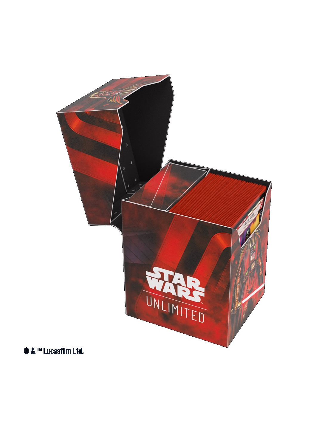Nuestra caja para mazos Soft Crate Star Wars™: Unlimited es la solución todo en uno para los fans de Star Wars™: Unlimited. Esta caja para mazos está impresa a todo color con diseños oficiales y además tiene muchas características ingeniosas. Sirve para guardar un mazo completo con doble funda y además incluye una caja para fichas innovadora. Esta caja tiene un mecanismo de cierre inteligente para que las fichas no se salgan, incluso si se saca la caja. Una vez abierta, la tapa se queda así para que puedas acceder fácilmente al contenido durante las partidas.