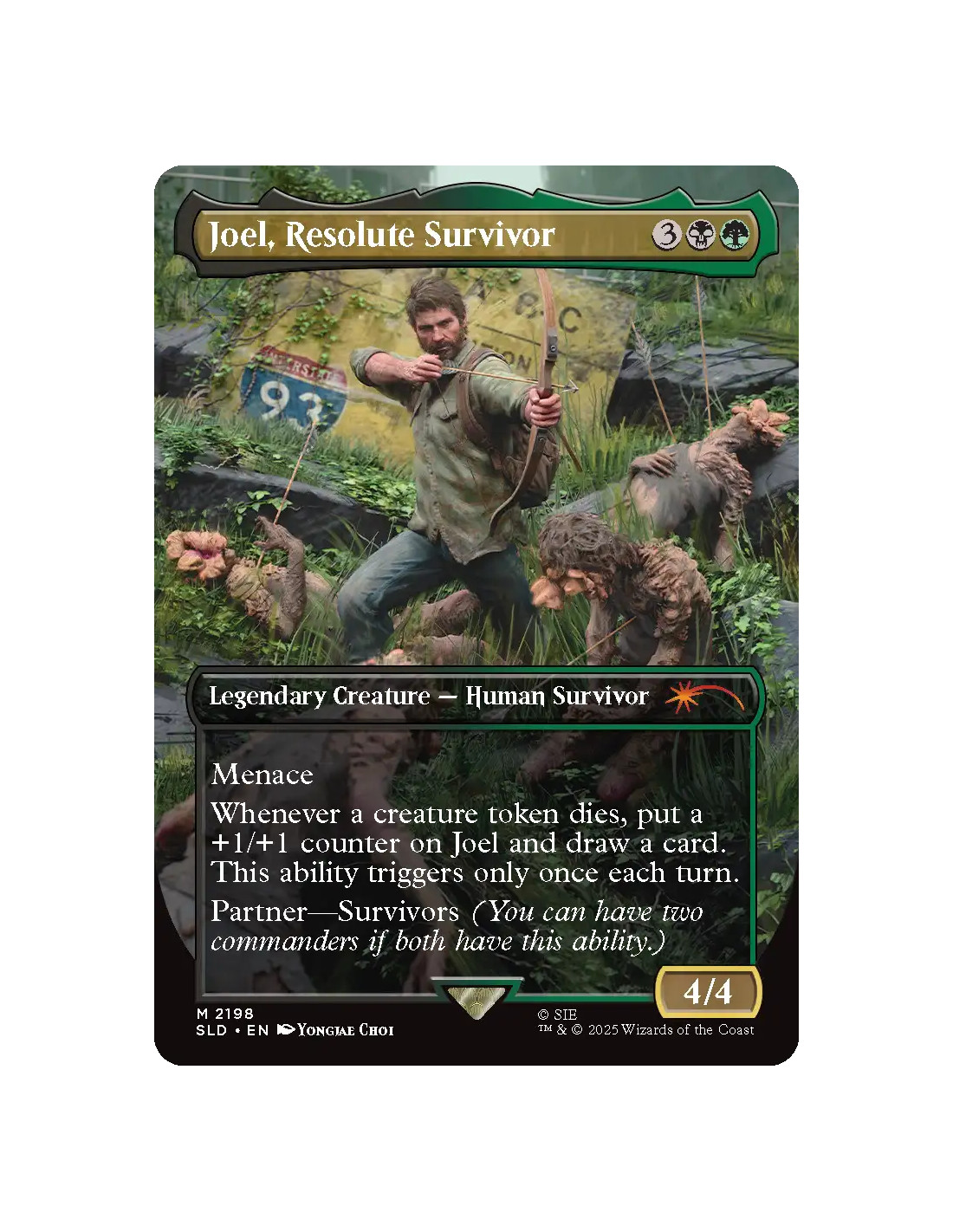 NOTA: La mecánica de camarada “Survivors” permite jugar las cartas de Joel y Ellie de Secret Lair x The Last of Us Part I con las cartas de Abby y Ellie de Secret Lair x The Last of Us Part II. Esto significa que, técnicamente, Ellie puede juntarse con su yo más joven (y Abby puede juntarse con Joel si eres un monstruo).